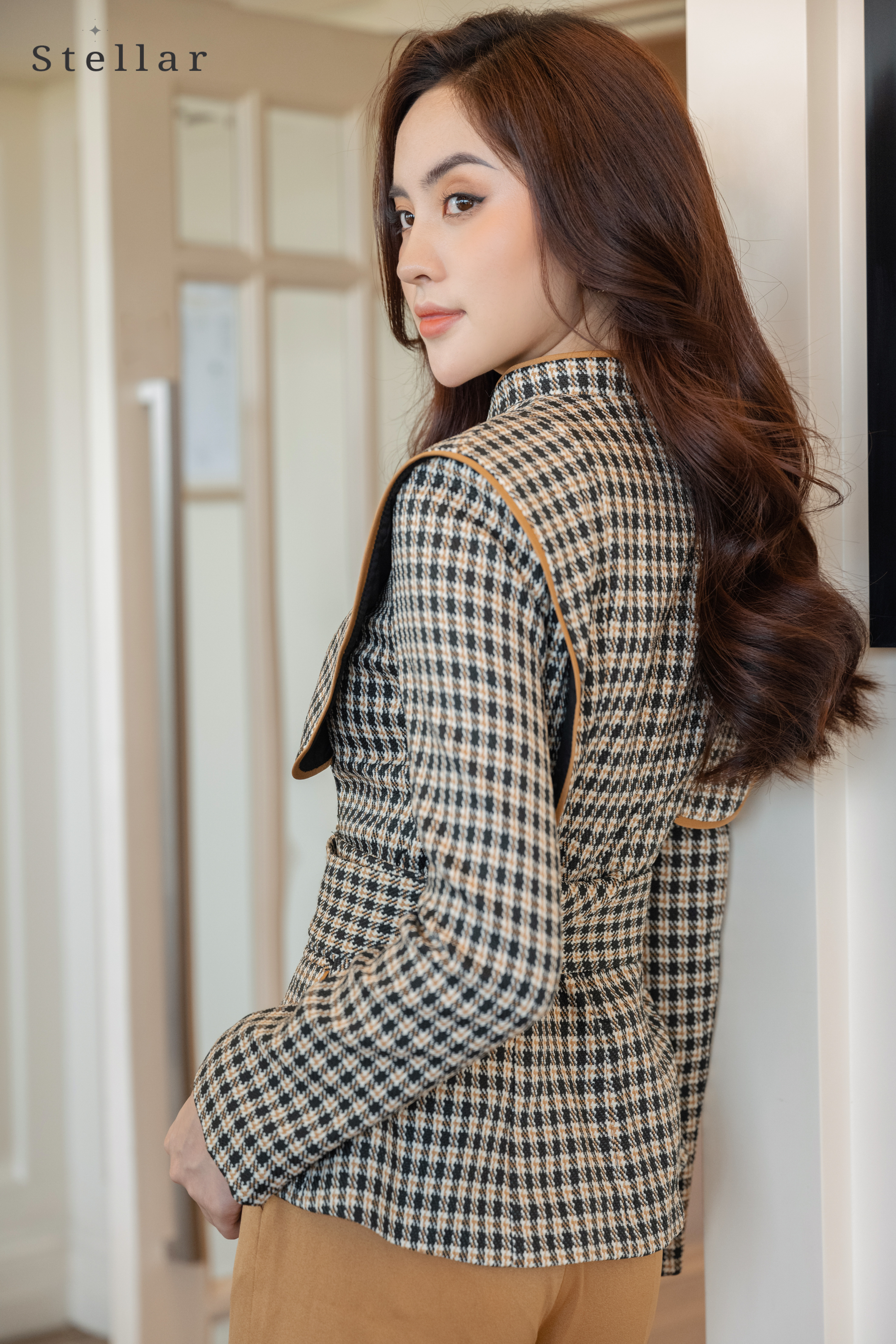 Kiểu dáng : Áo dạ Tweed kẻ caro màu nâu, cổ tàu cao, vai chờm viền đồng màu, tay dài, dây đai eo bản to, chiết eo, khuy đồng
