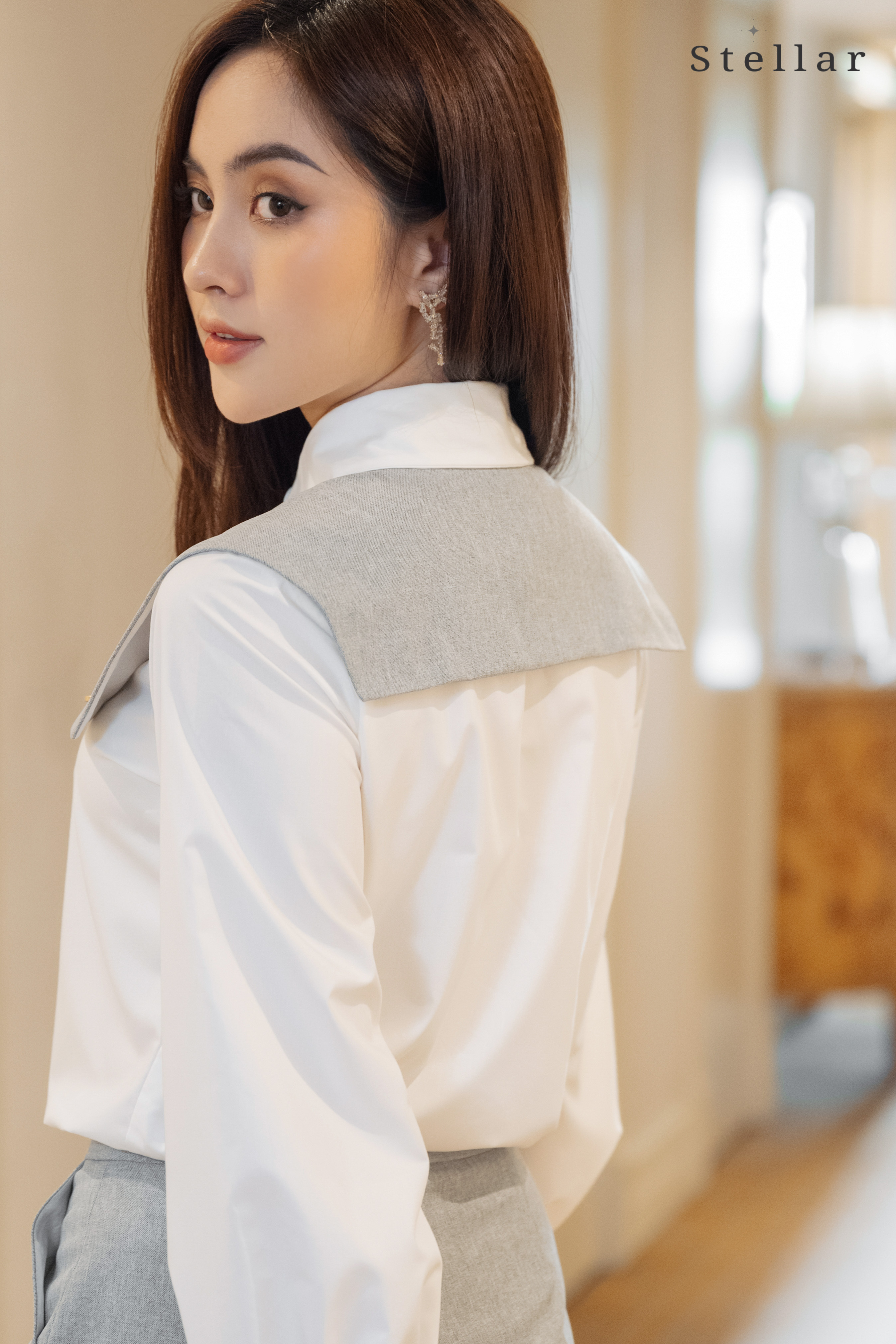 Kiểu dáng: Áo sơ mi trắng, chất thô ướt, phối đáp vai vải ghi, cúc đồng