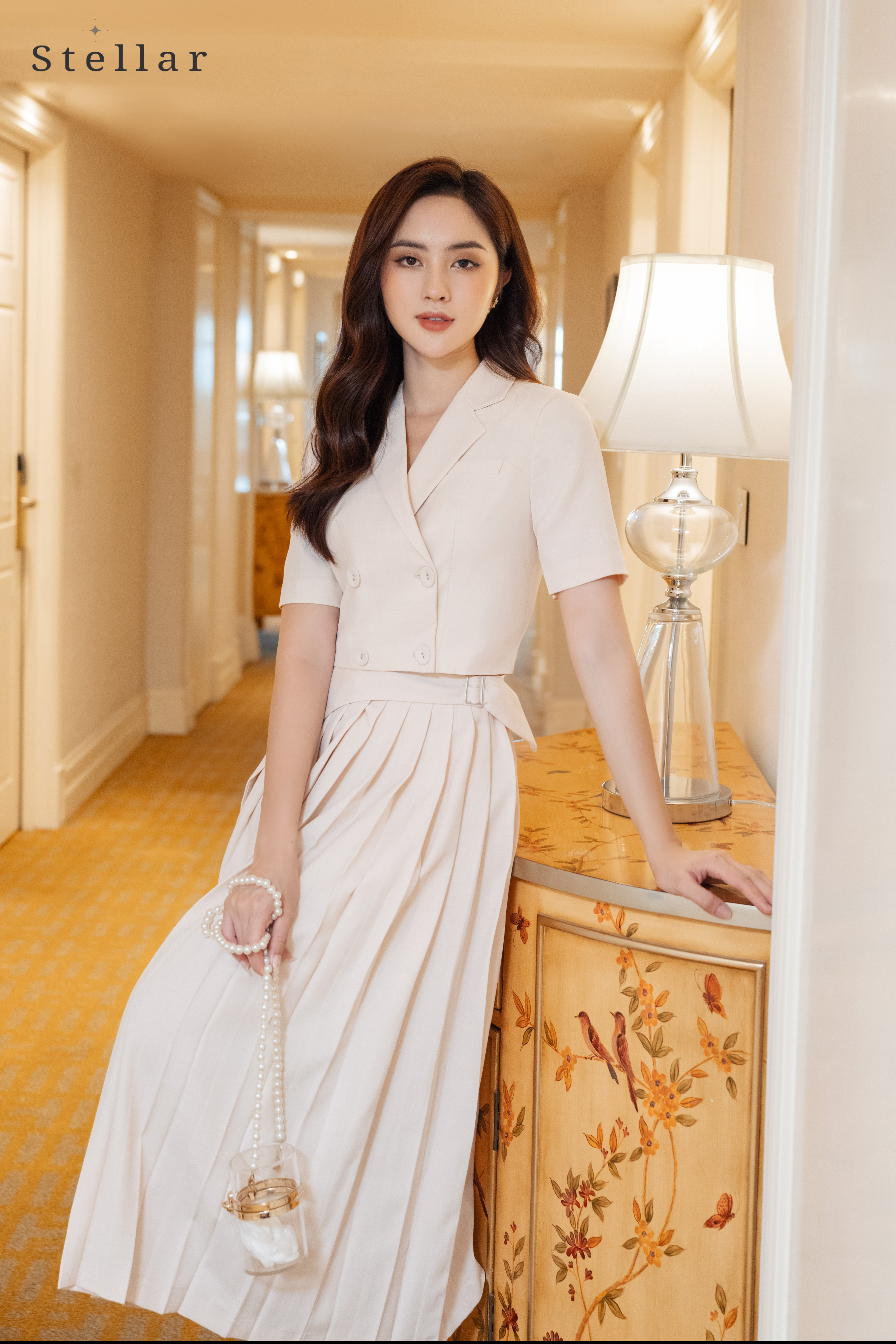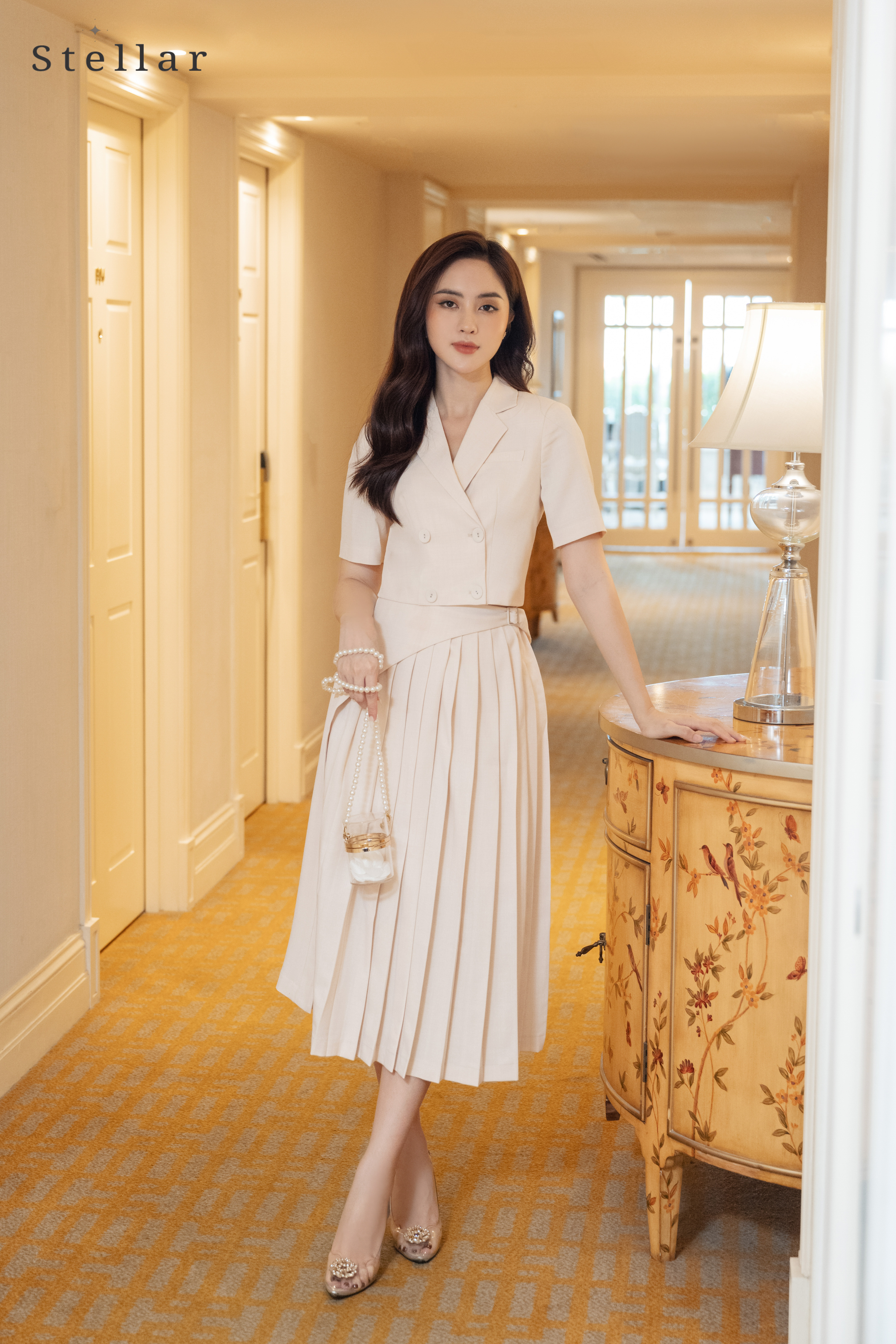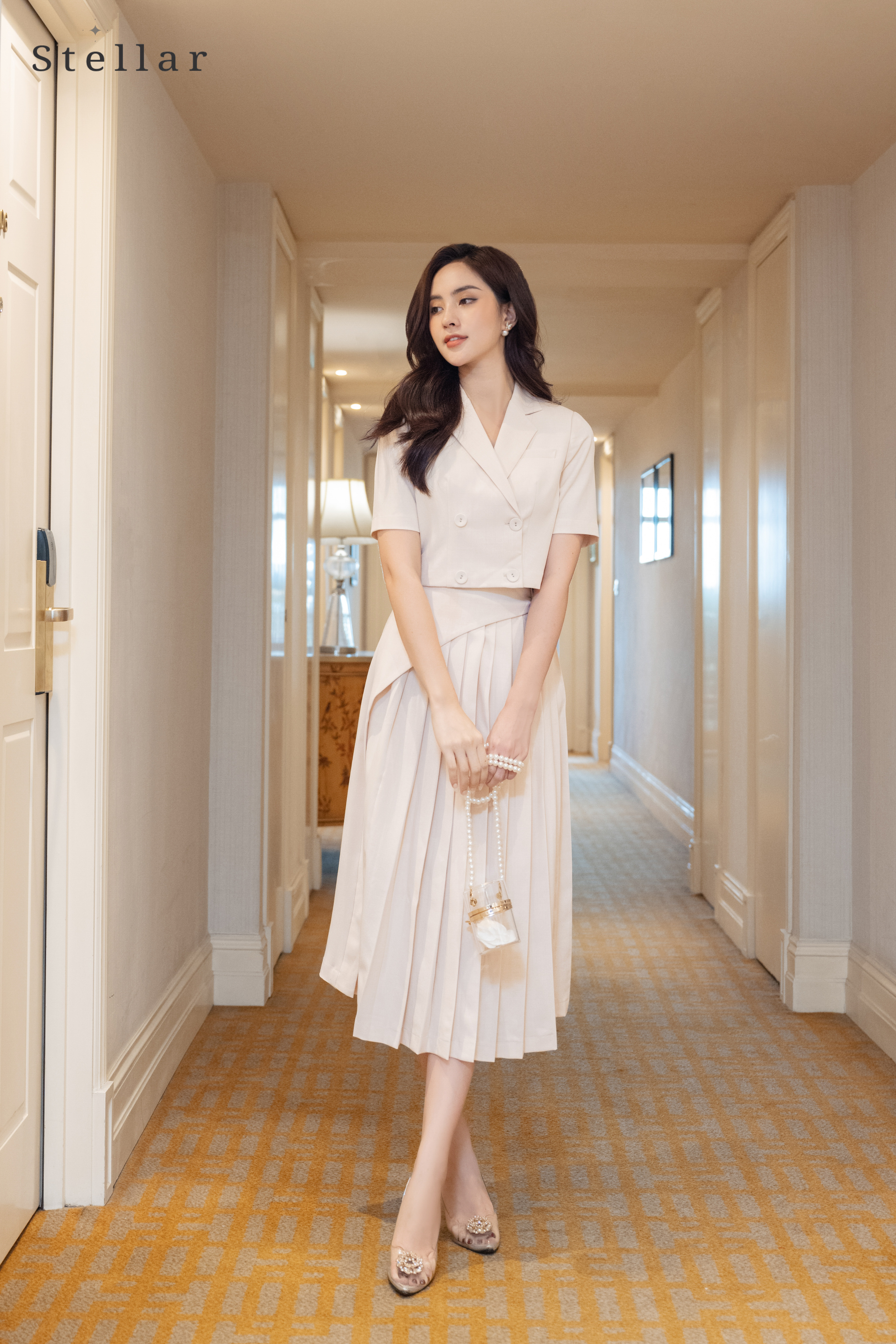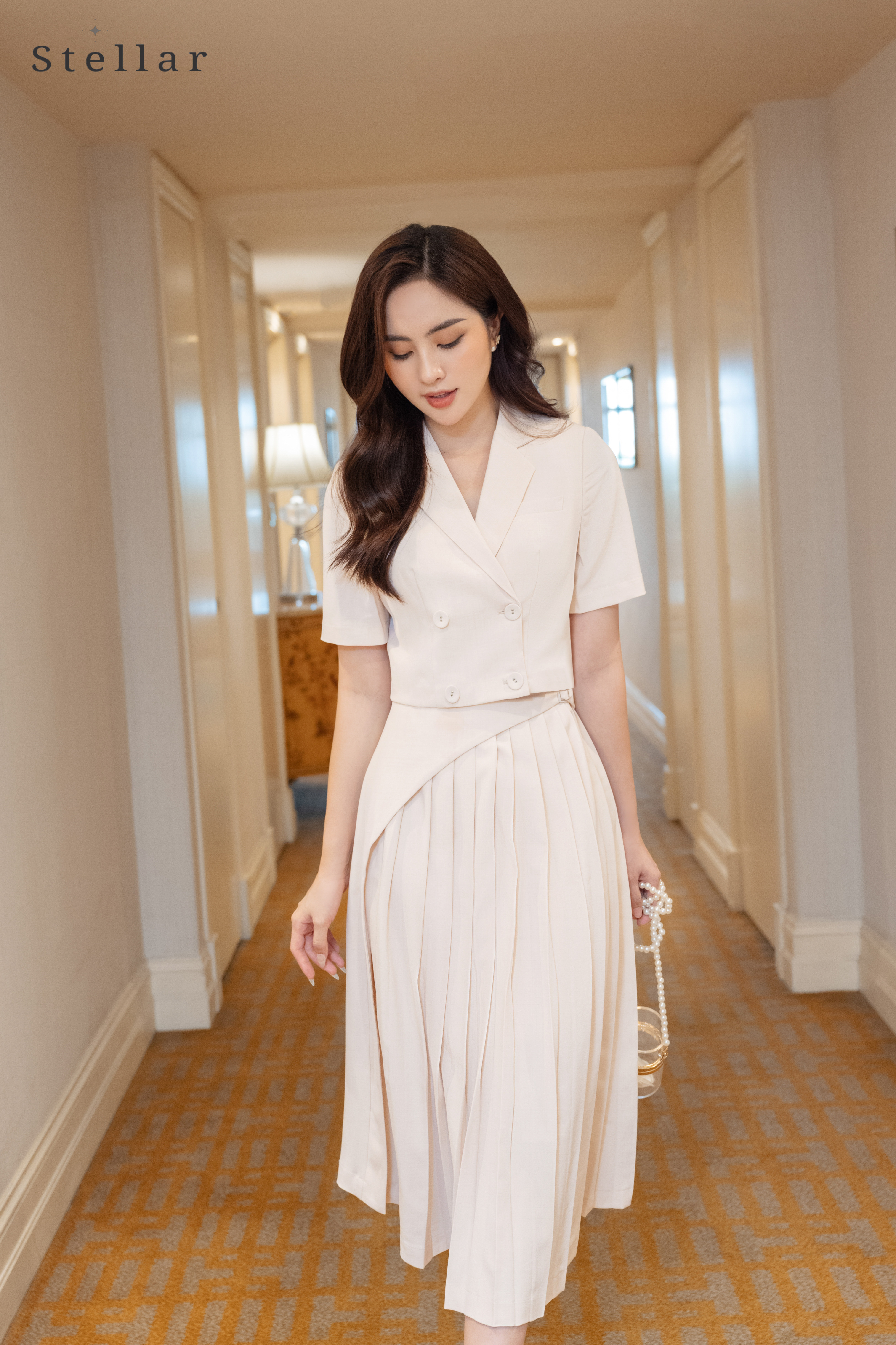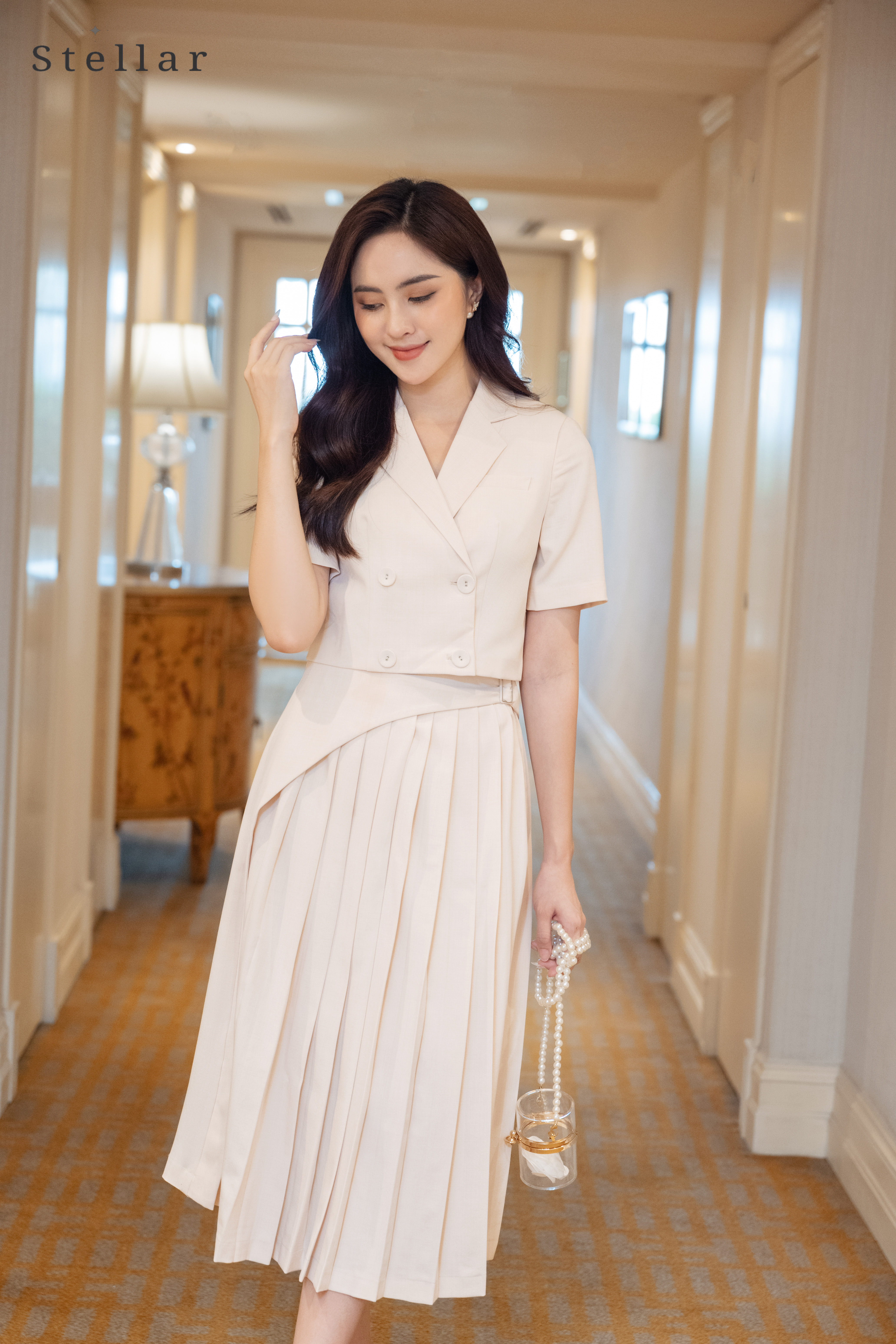 Kiểu dáng: Áo vest croptop màu trắng kem, tay lỡ; Chân váy xếp ly kèm vạt chéo thân trước