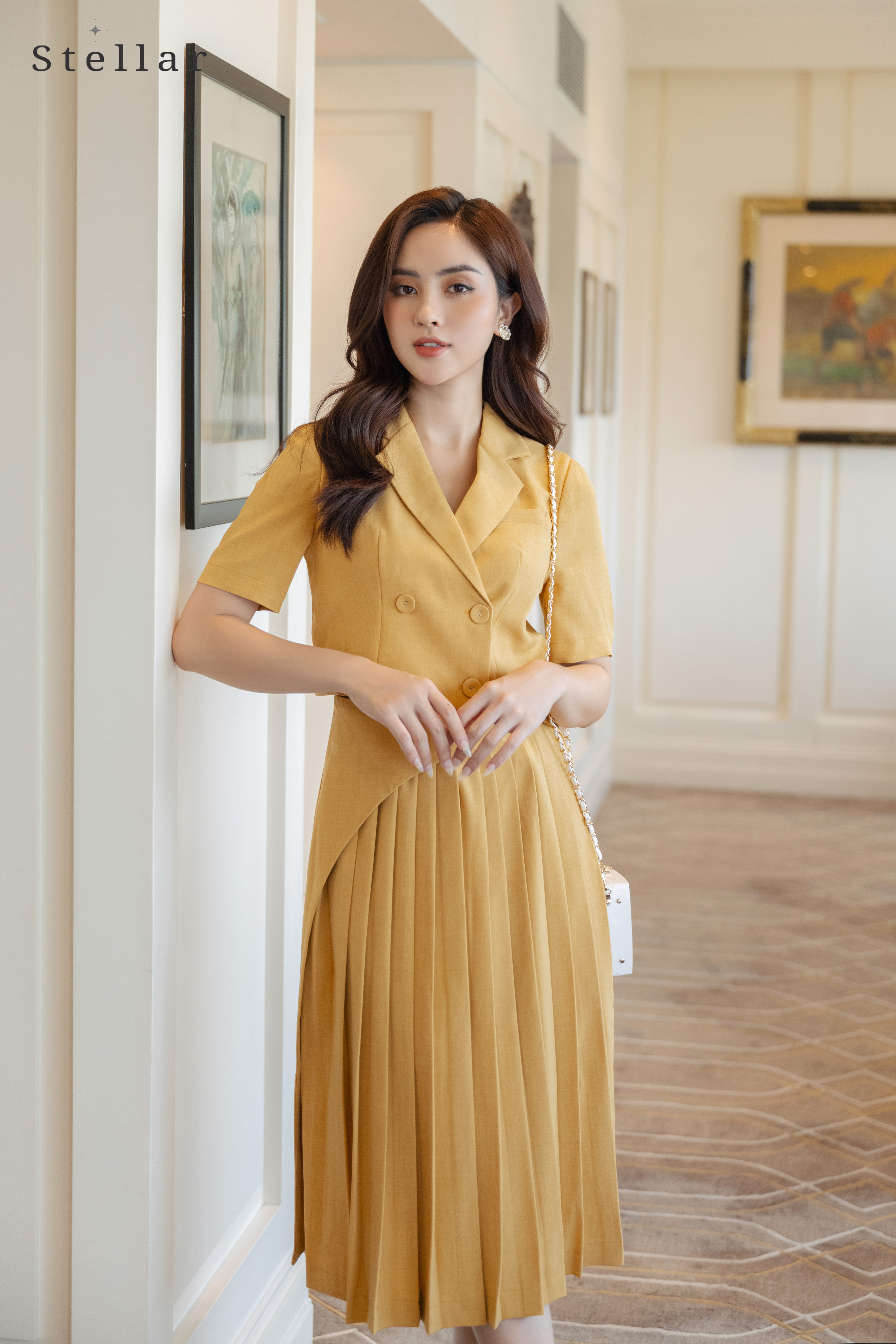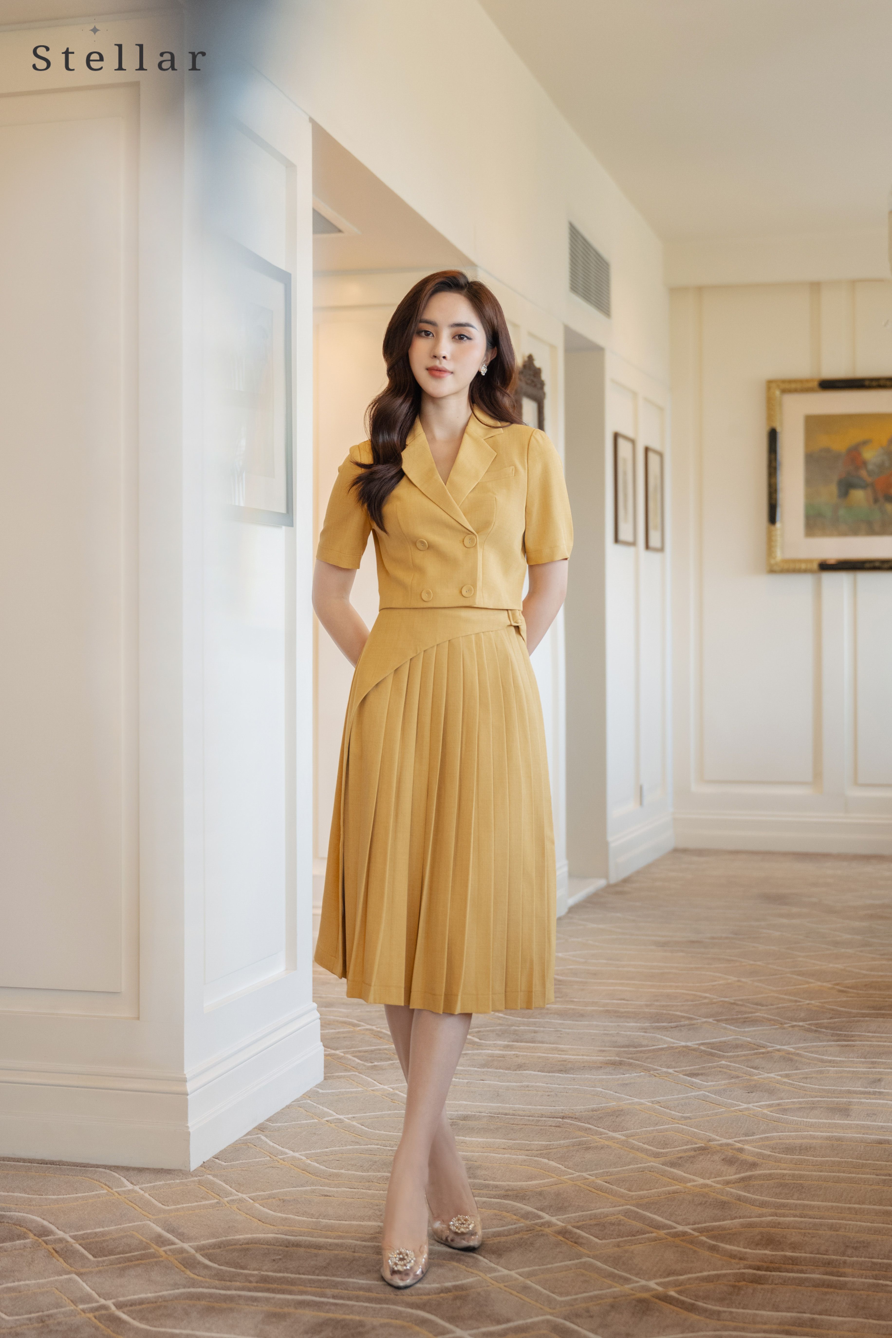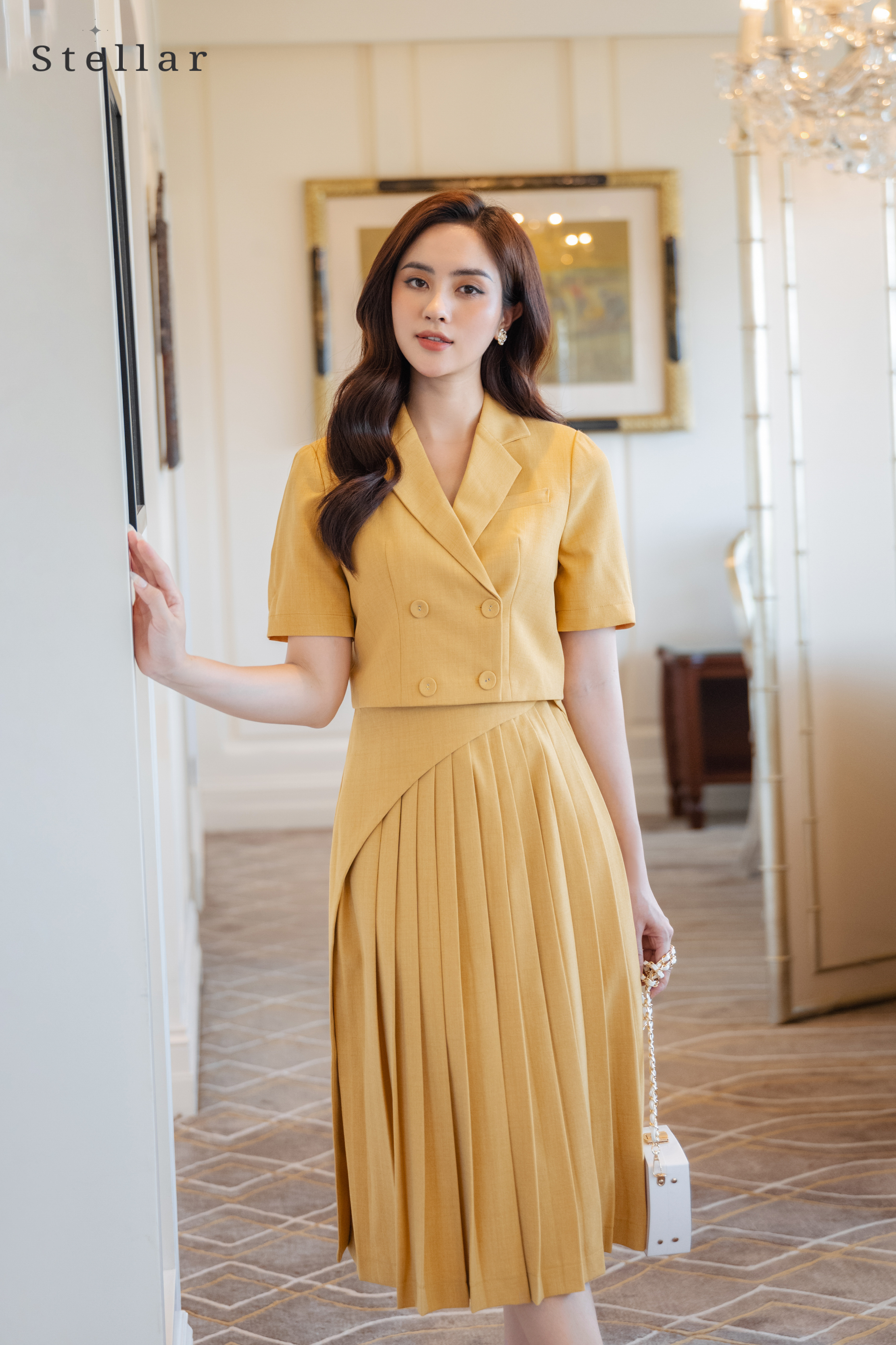 Kiểu dáng: Áo vest croptop màu vàng, tay lỡ; Chân váy xếp ly kèm vạt chéo thân trước