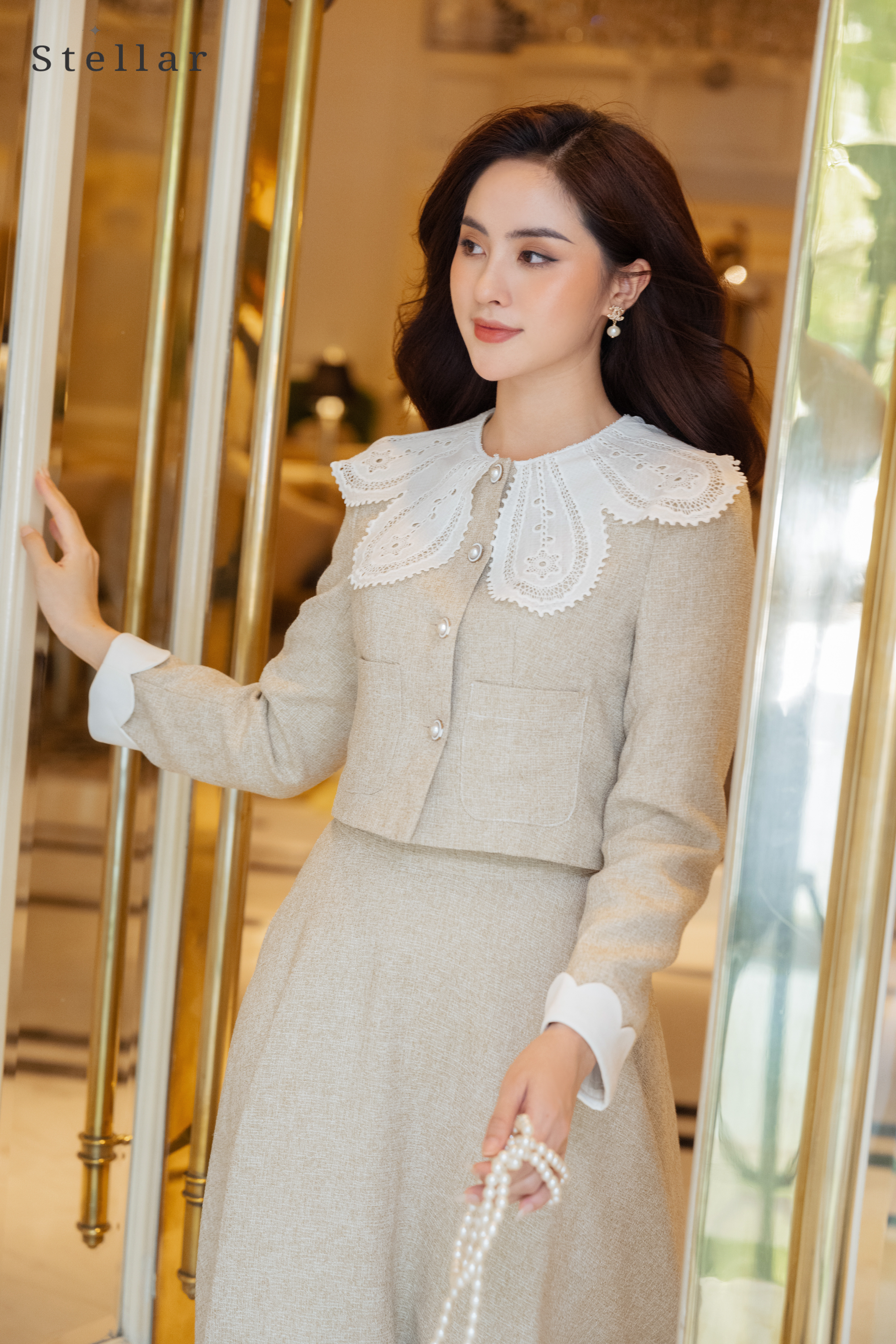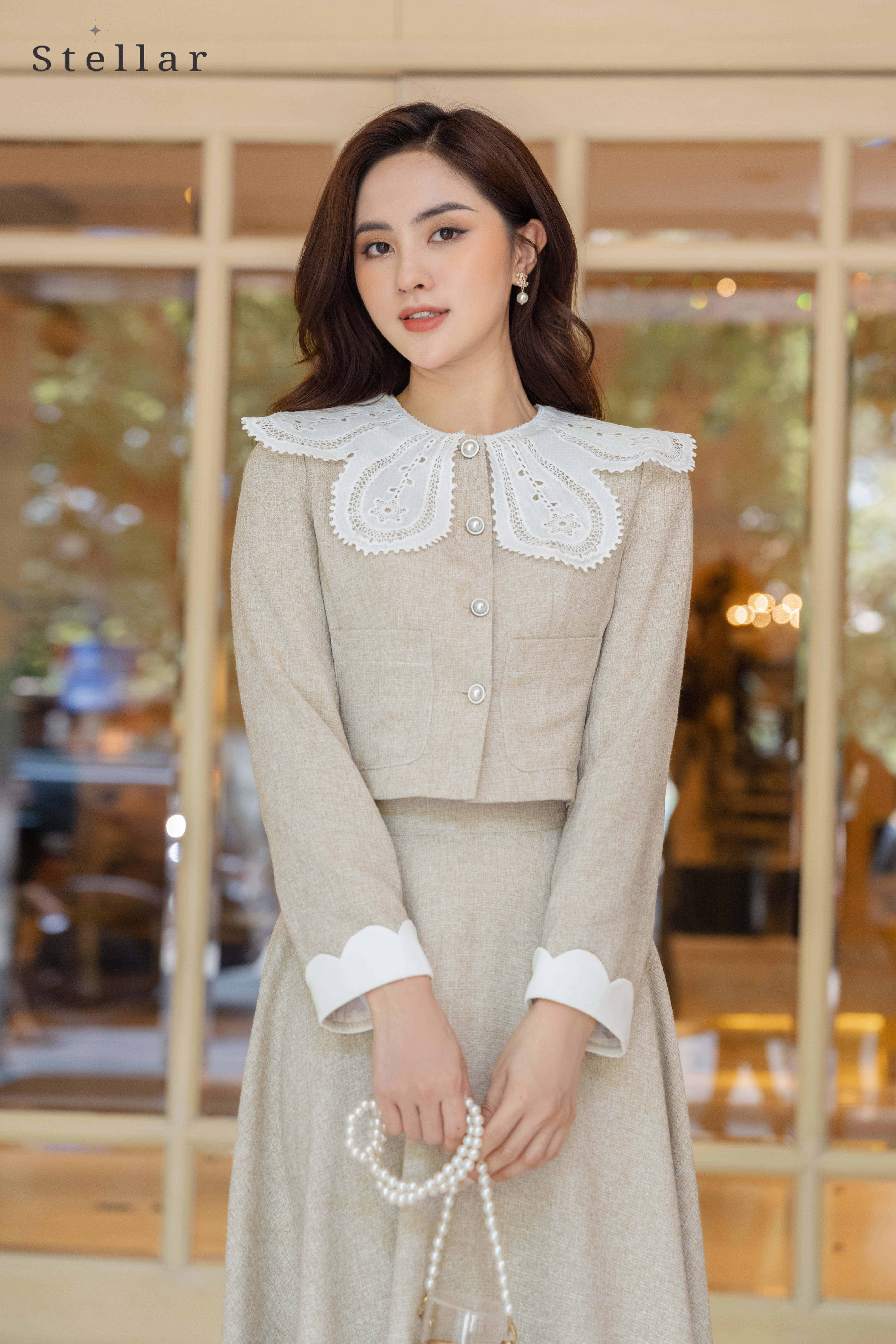Chất liệu: dạ tweed. chân váy dài 73cm, 2 lớp.