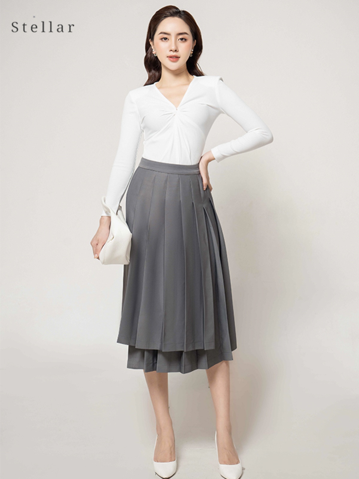 Kiểu dáng: Chân váy dập ly súp, vạt chéo lệch.