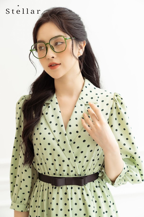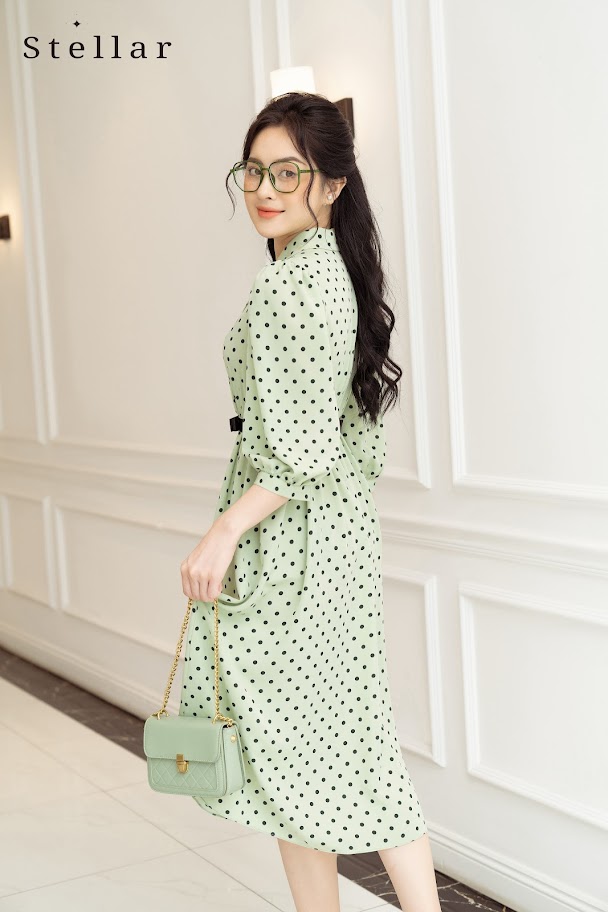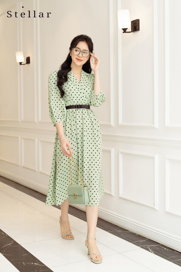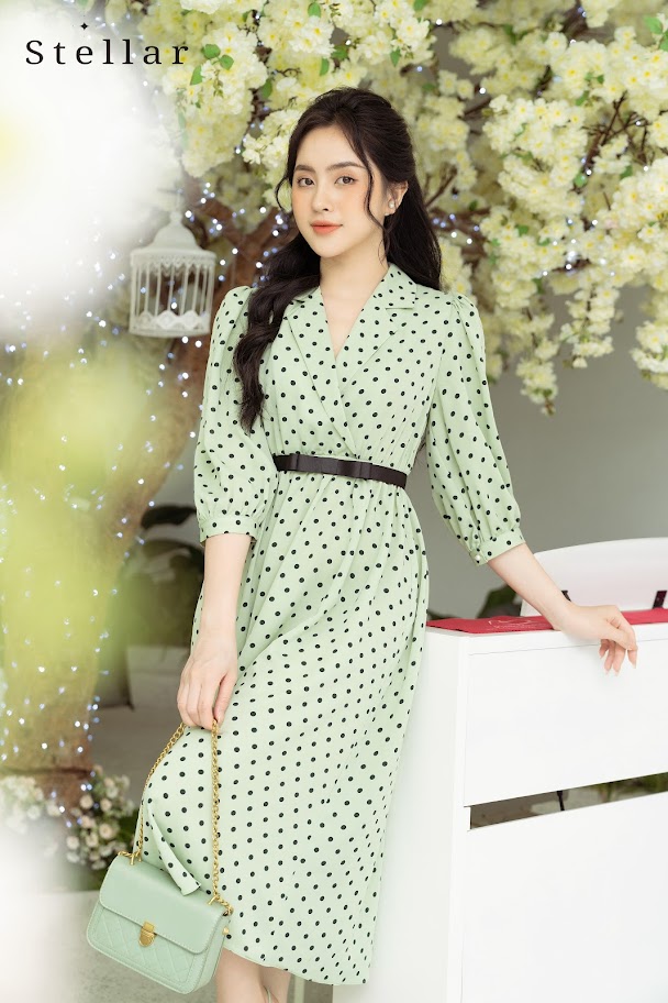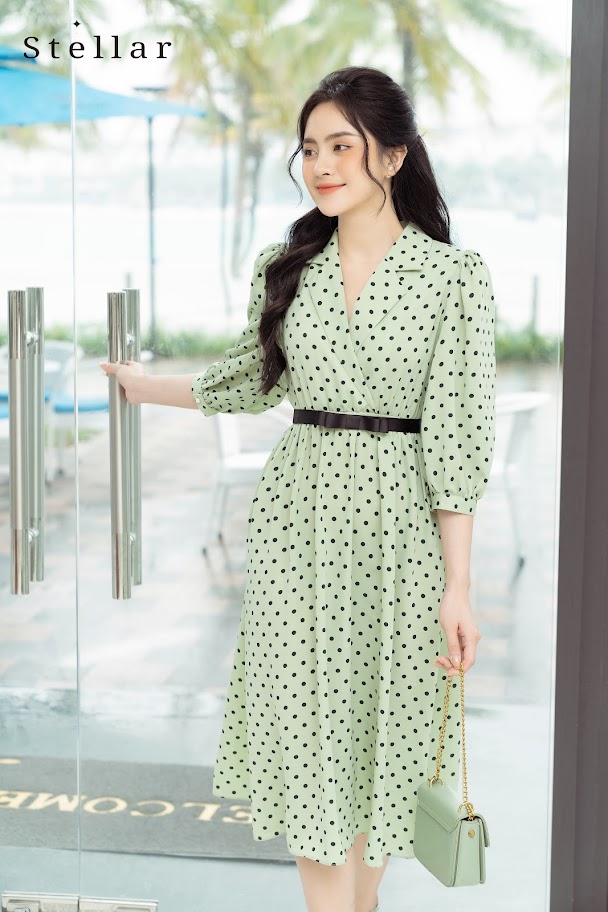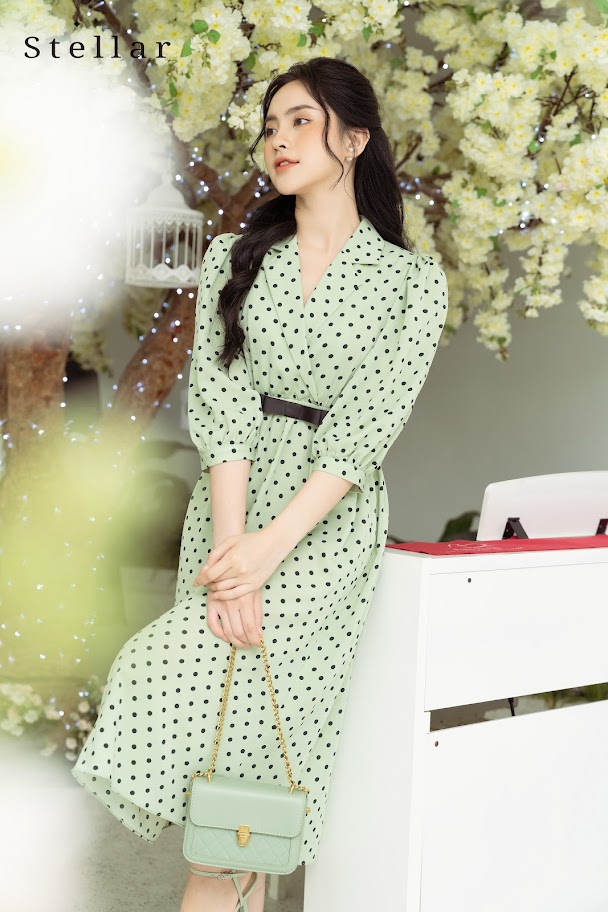 Chất liệu: Đầm chấm bi xanh bơ, cổ vest, tay lửng, eo chun