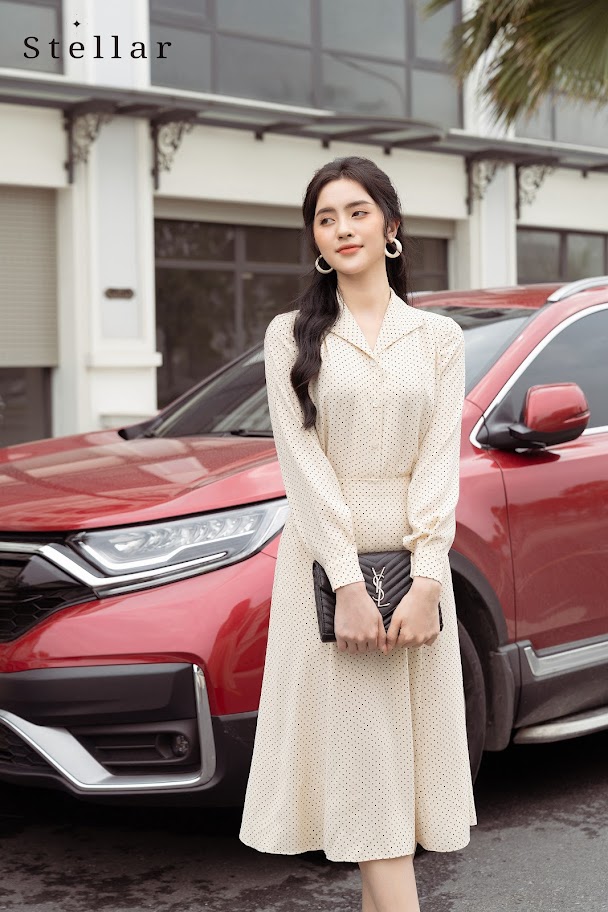 Chất liệu: Set rời lụa Nhật chấm bi nhỏ, áo cổ sơ mi cách điệu, tay dài, chân váy xoè