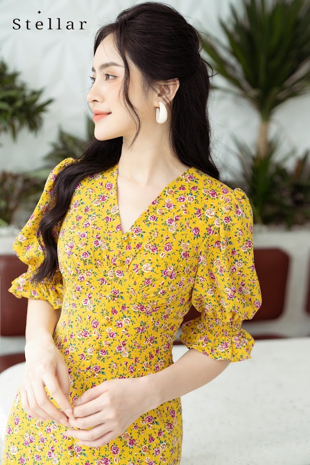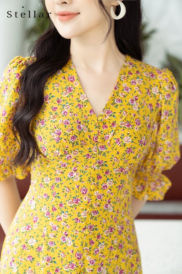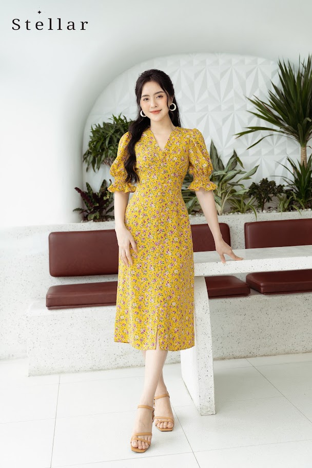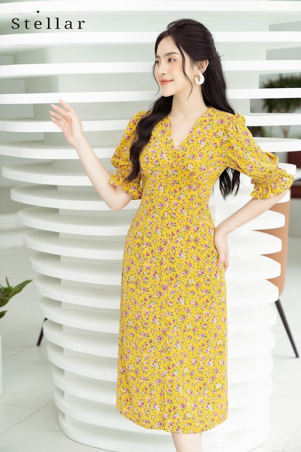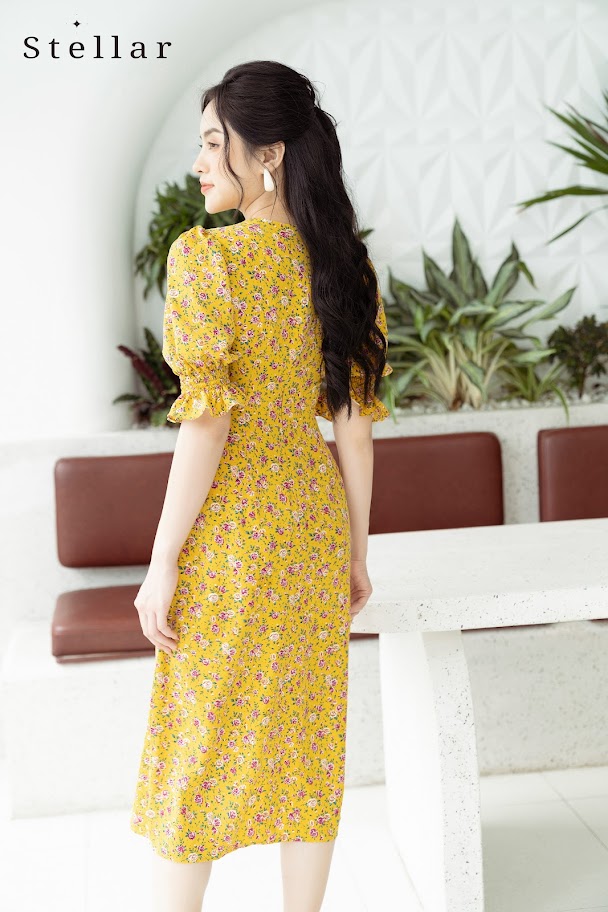 Đầm hoa midi tay bồng hoa vàng
