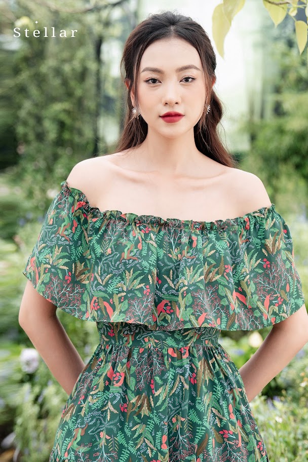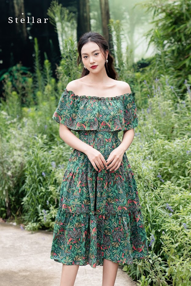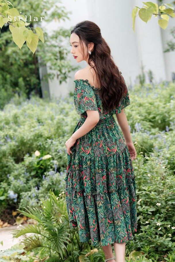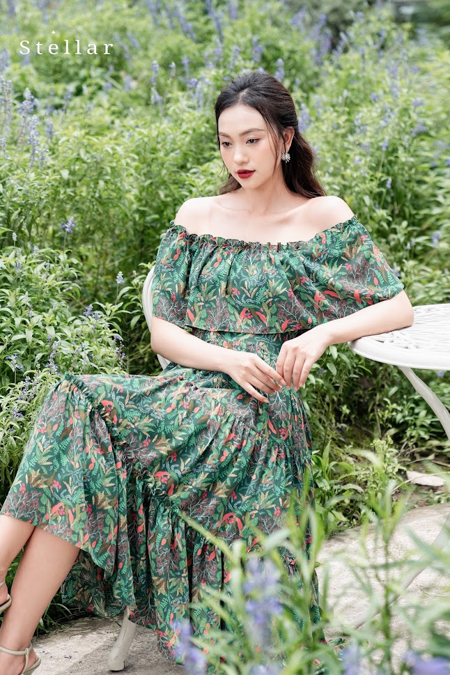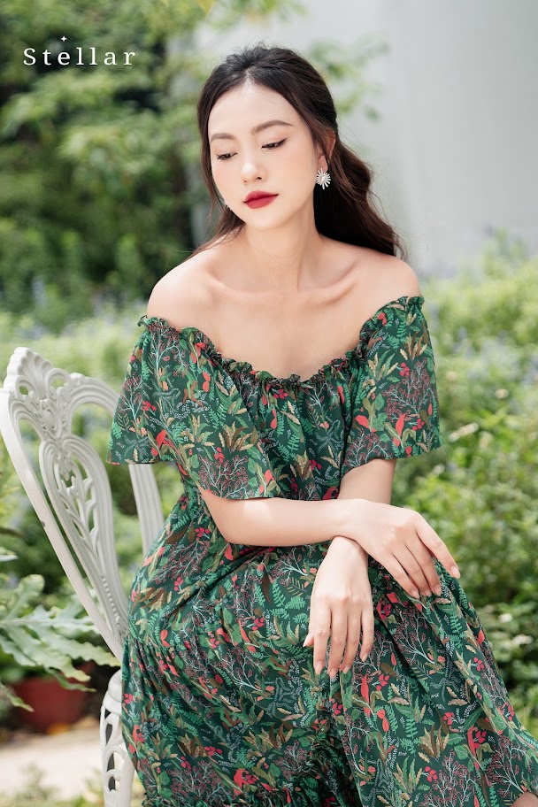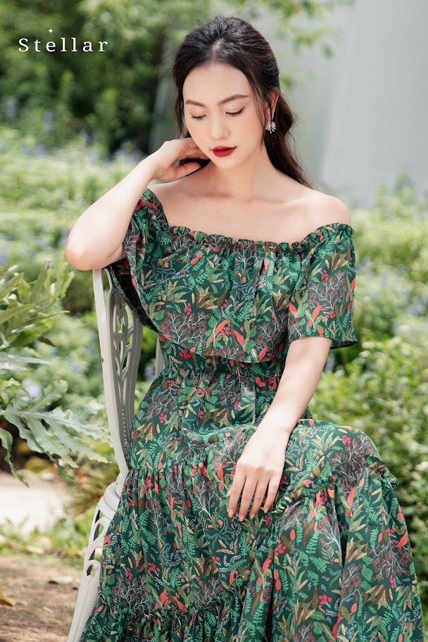 Kiểu dáng: Đầm maxi trễ vai, chân váy nhún xoè 3 tầng