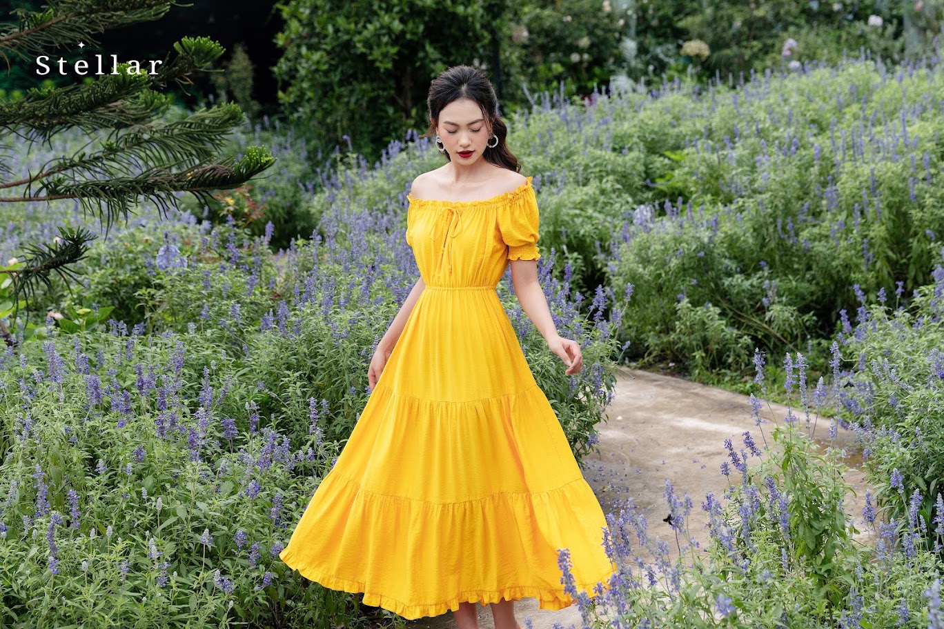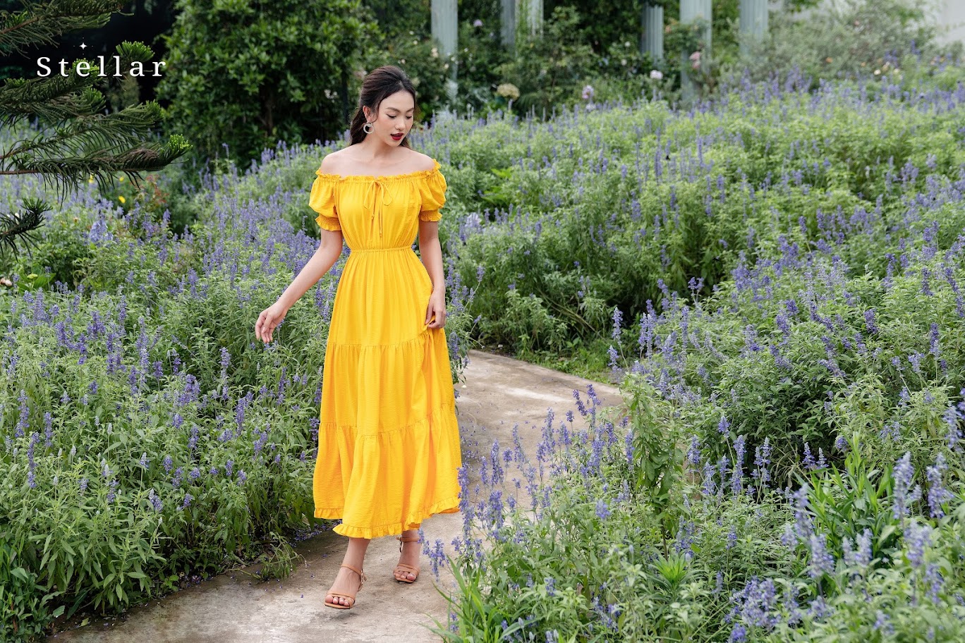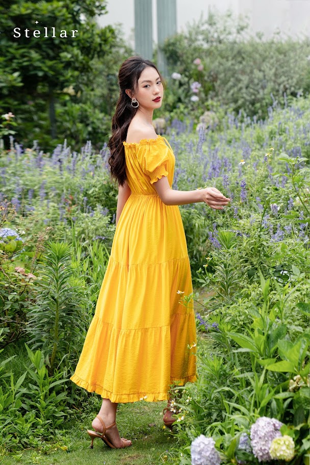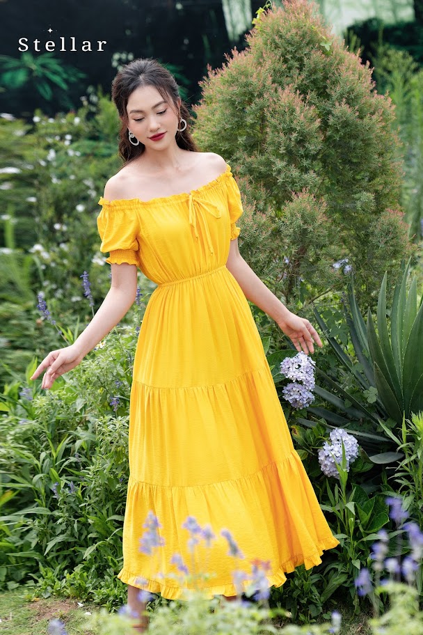 Kiểu dáng: Đầm maxi trễ vai, ba tầng, chun eo, chun tay