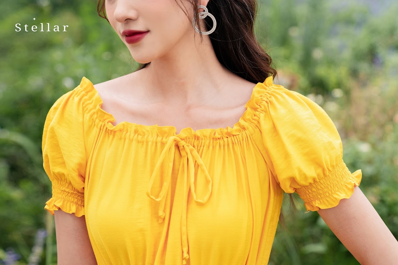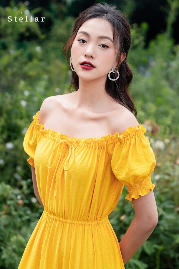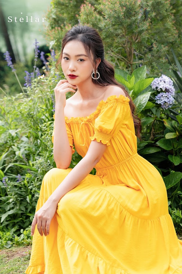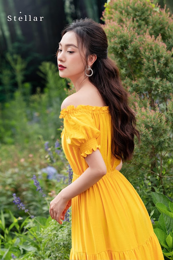 Kiểu dáng: Đầm maxi trễ vai, ba tầng, chun eo, chun tay