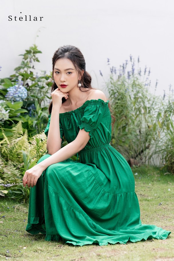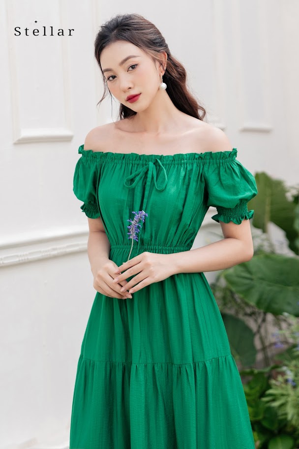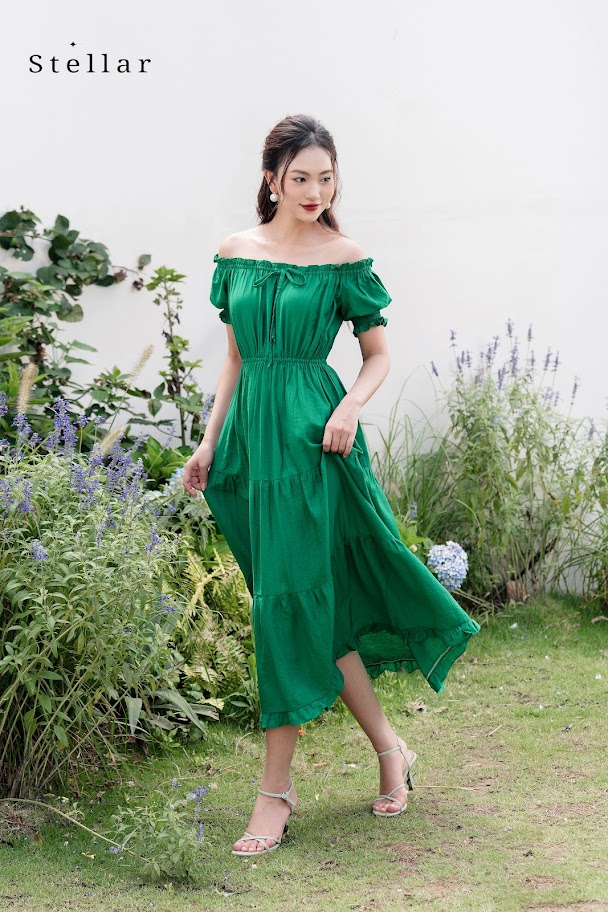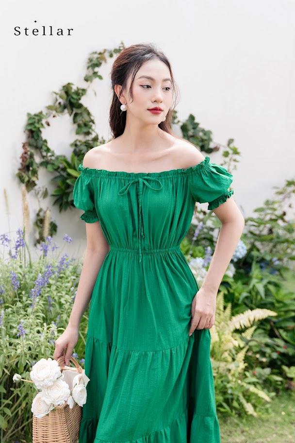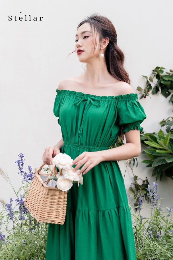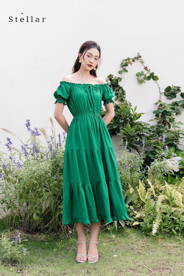 Kiểu dáng: Đầm maxi trễ vai, ba tầng, chun eo, chun tay