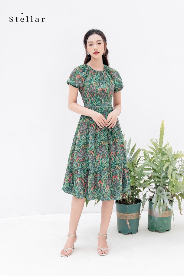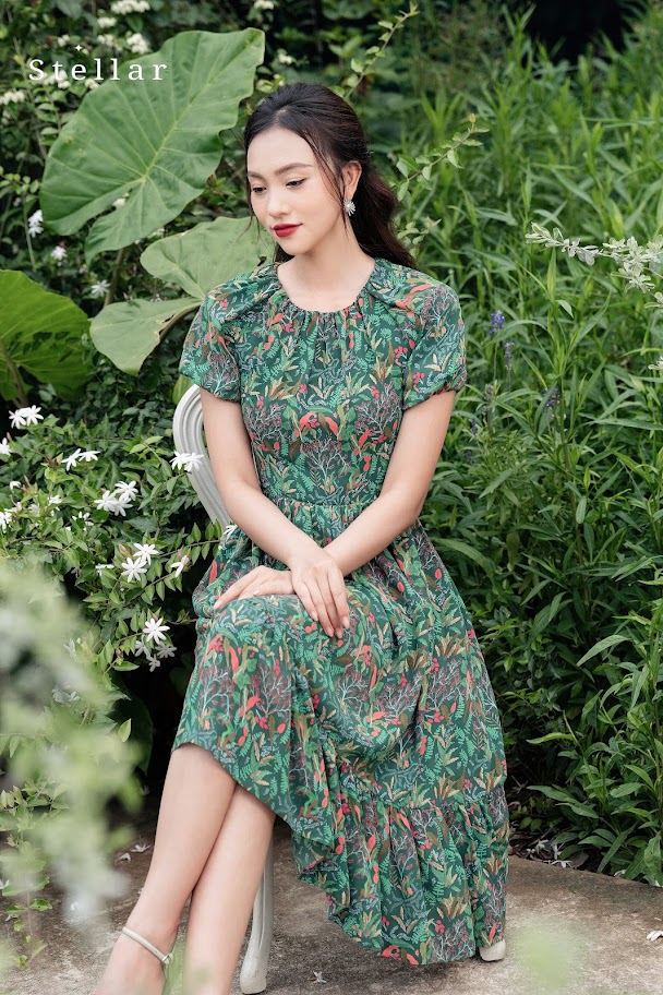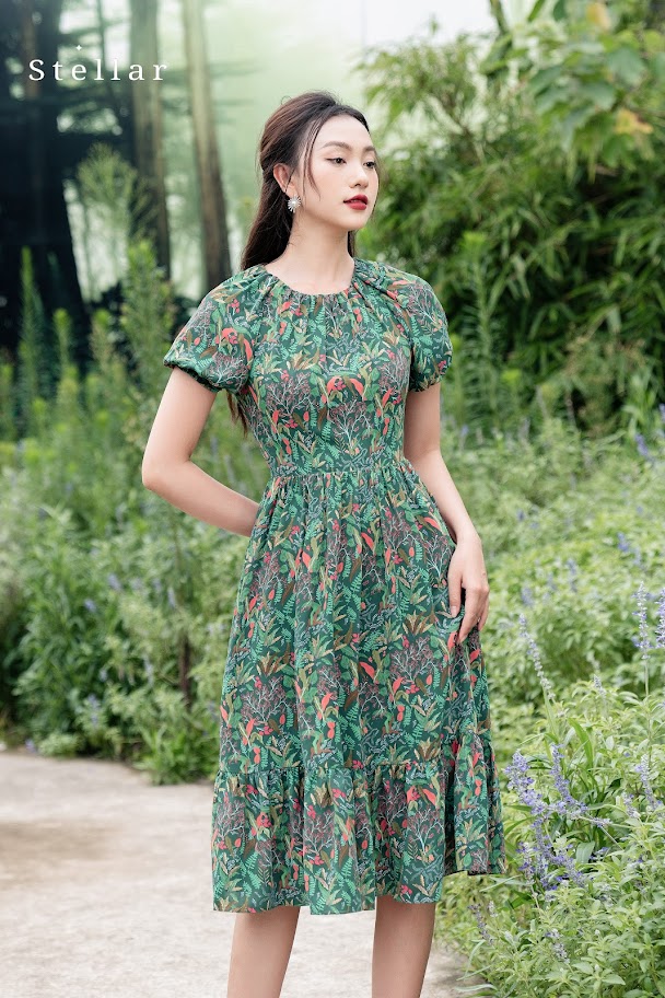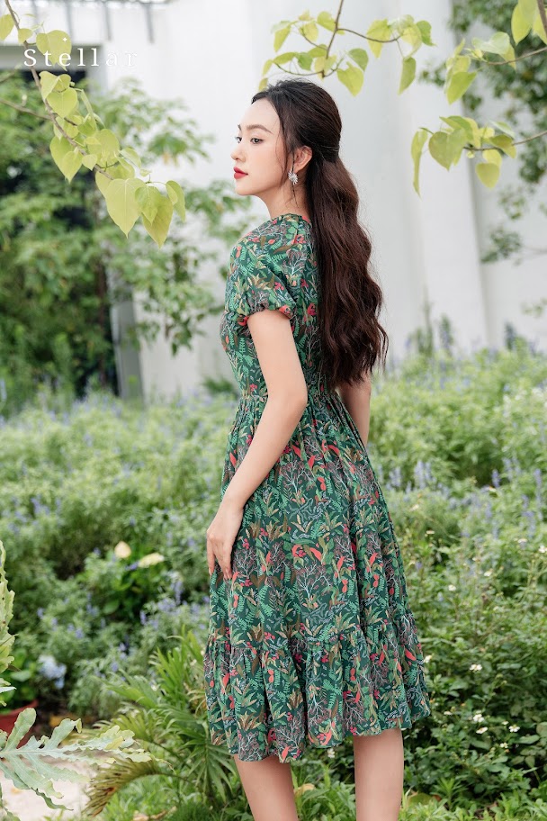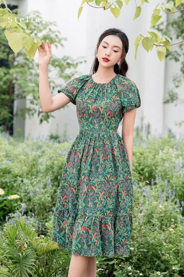 Kiểu dáng: Đầm lụa mịn hoạ tiết hoa lá nhiệt đới, xanh lá cây, cổ tròn nhún, tay ngắn,vai zaglag, ôm eo, chân váy xoè nhún,