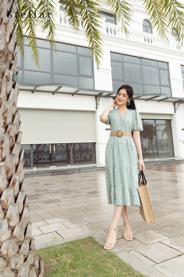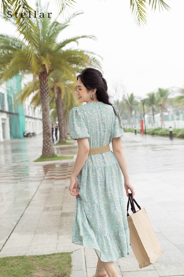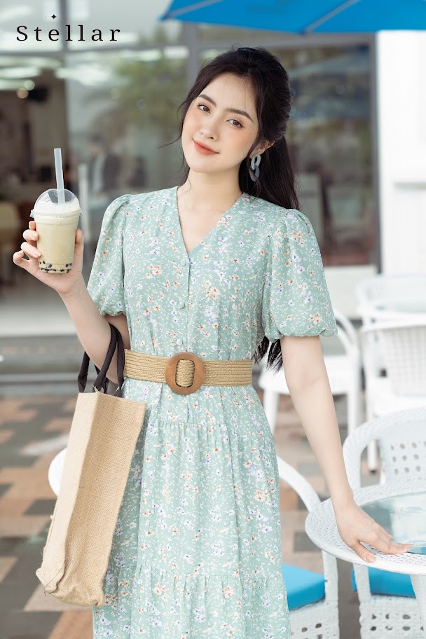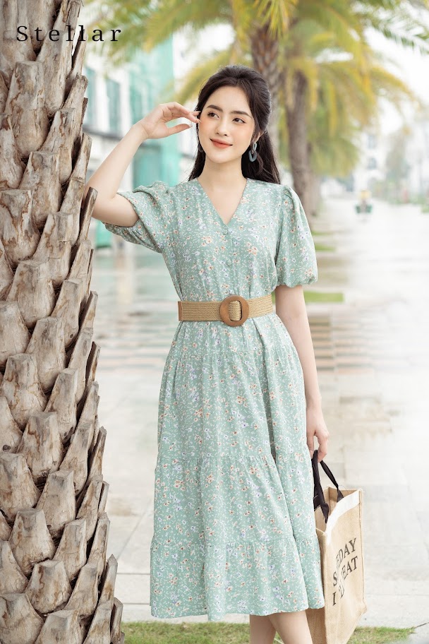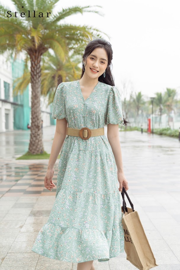 Chất liệu: Đầm lụa Nhật dáng xoè hoa nhí cổ V, nhún xoè 3 tầng, đai thắt eo, tay bồng, 1 lớp, vải nhẹ, mát, không nhăn