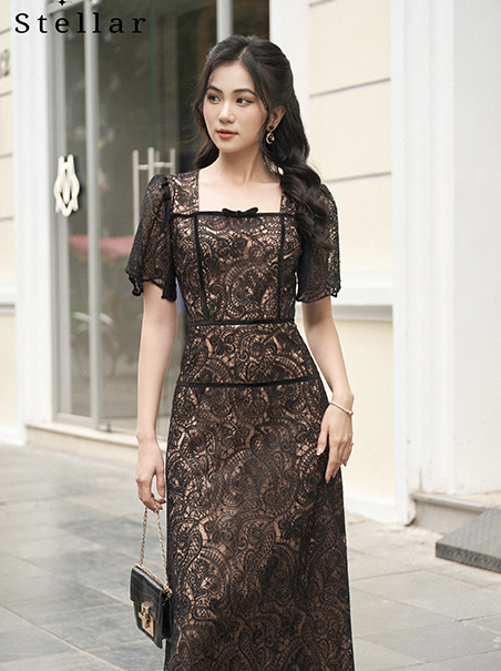 Kiểu dáng: Đầm ren 3D đen phối lót lụa màu da cam. Nơ và đường viền nhung cao cấp