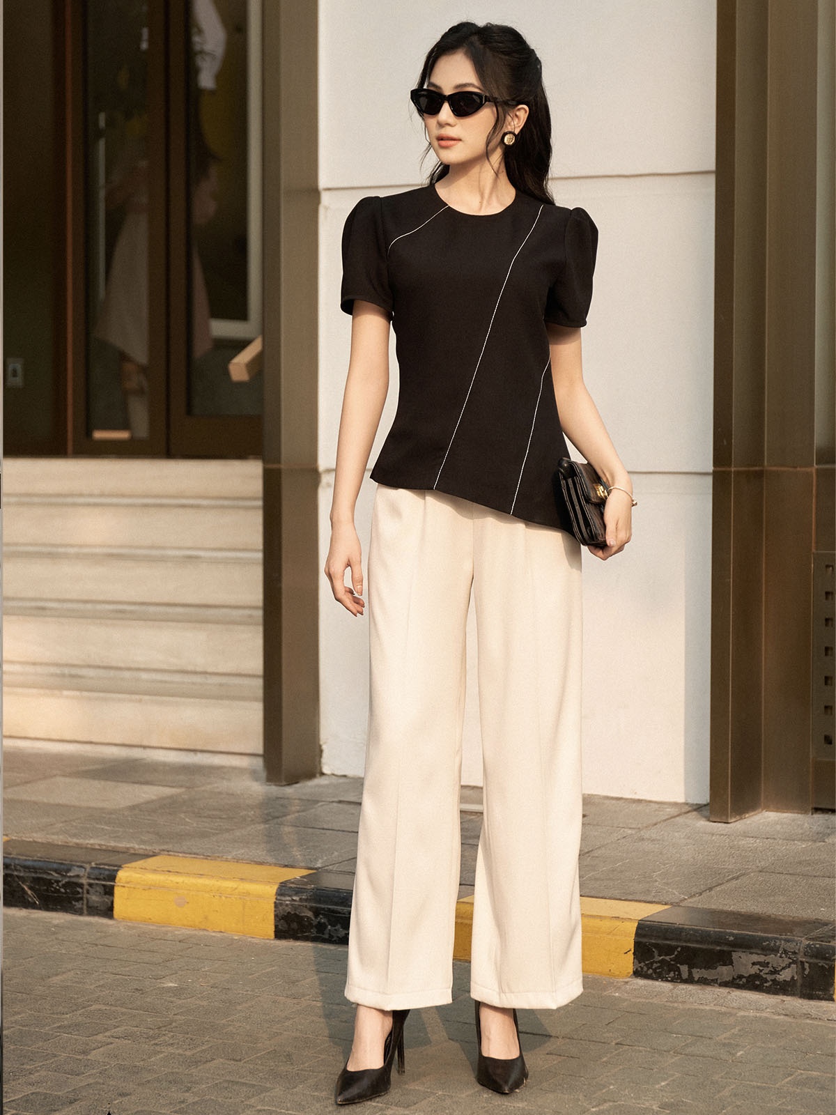 Kiểu dáng: Quần xuông A nhẹ, cạp cao, màu be, phối ly gập, chỉ đen cạp quần.