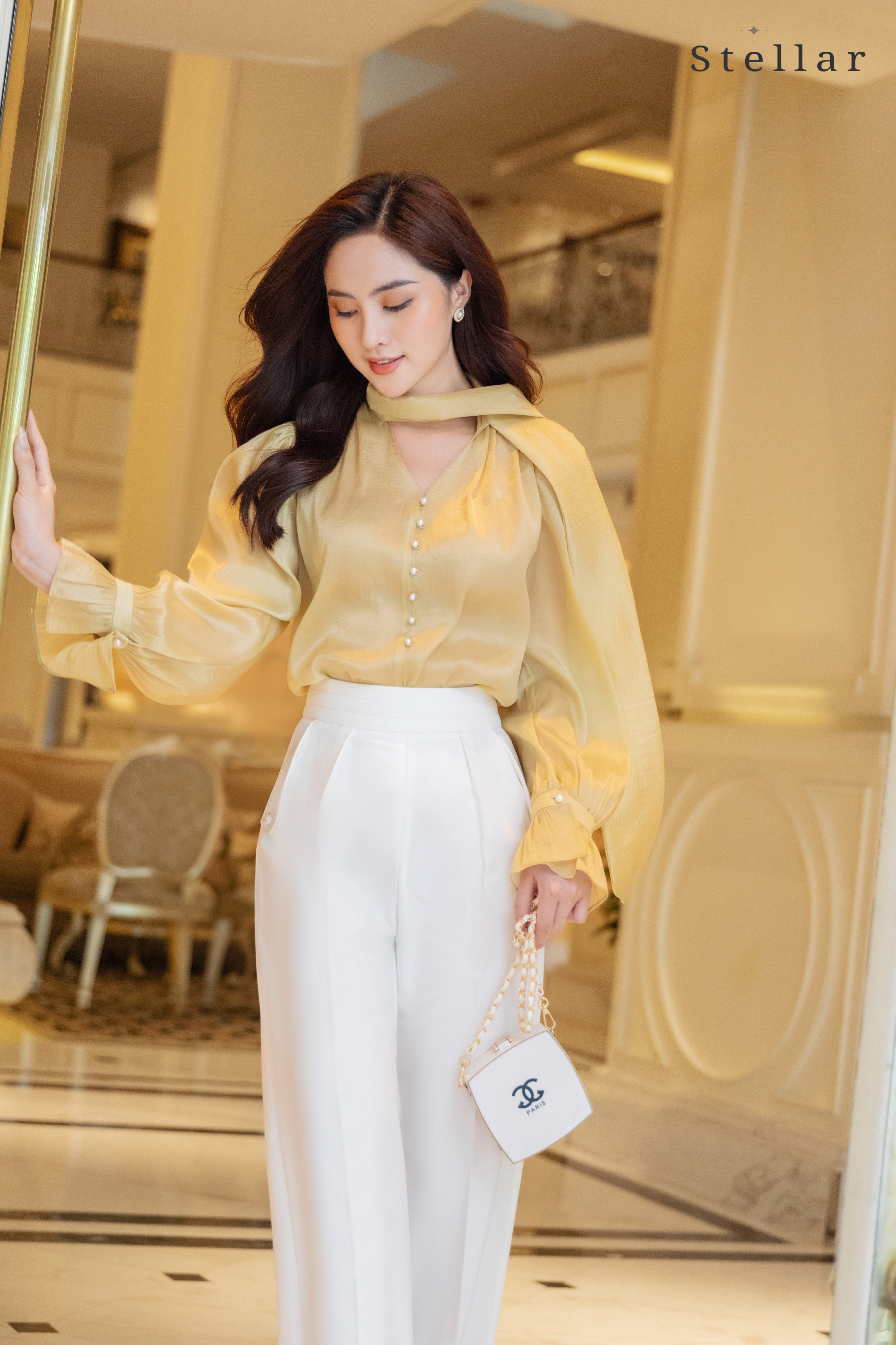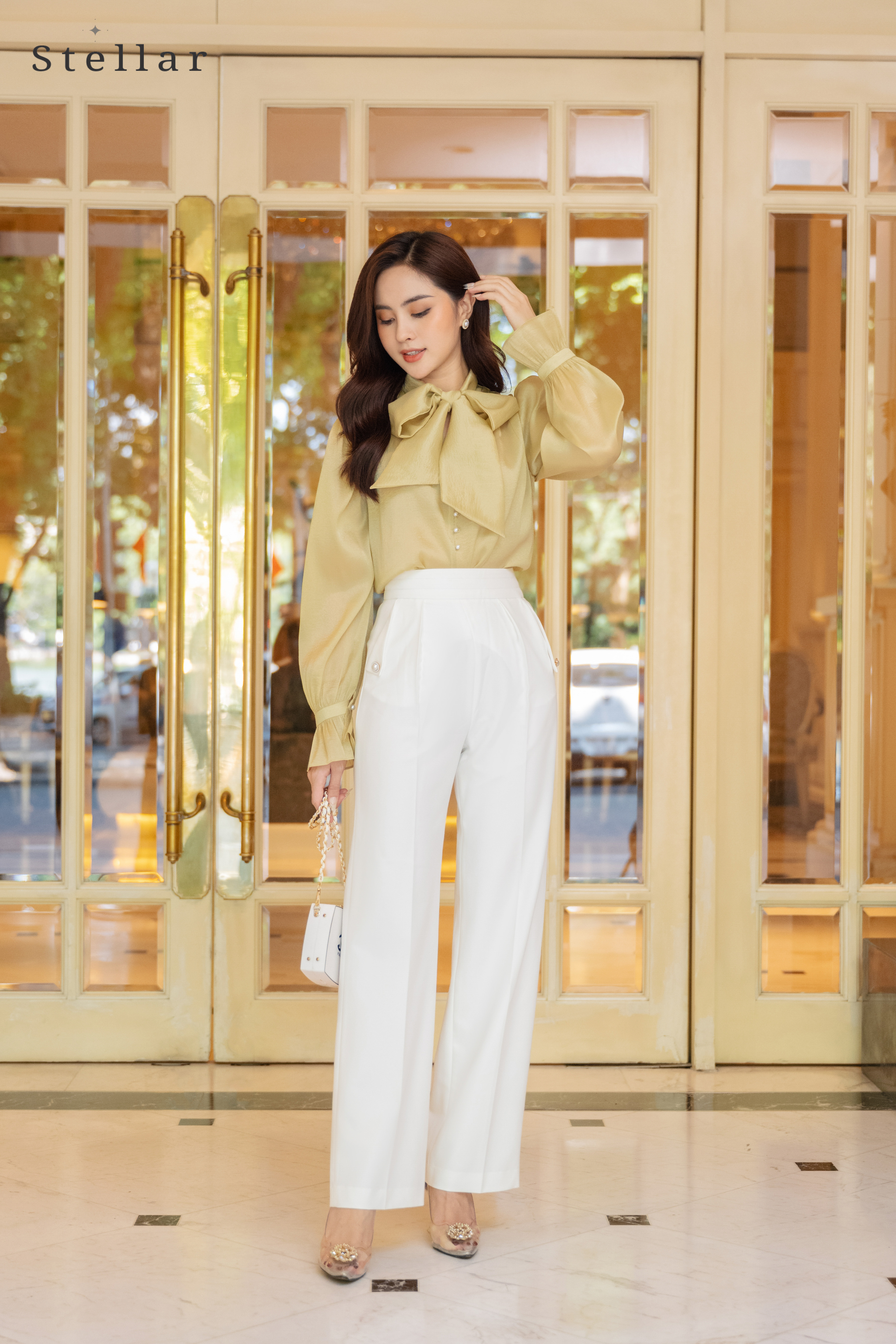 Kiểu dáng: Quần xuông A nhẹ, cạp cao, xếp ly ở cạp quần, ly bung nhẹ, nắp túi lật đính cúc ngọc