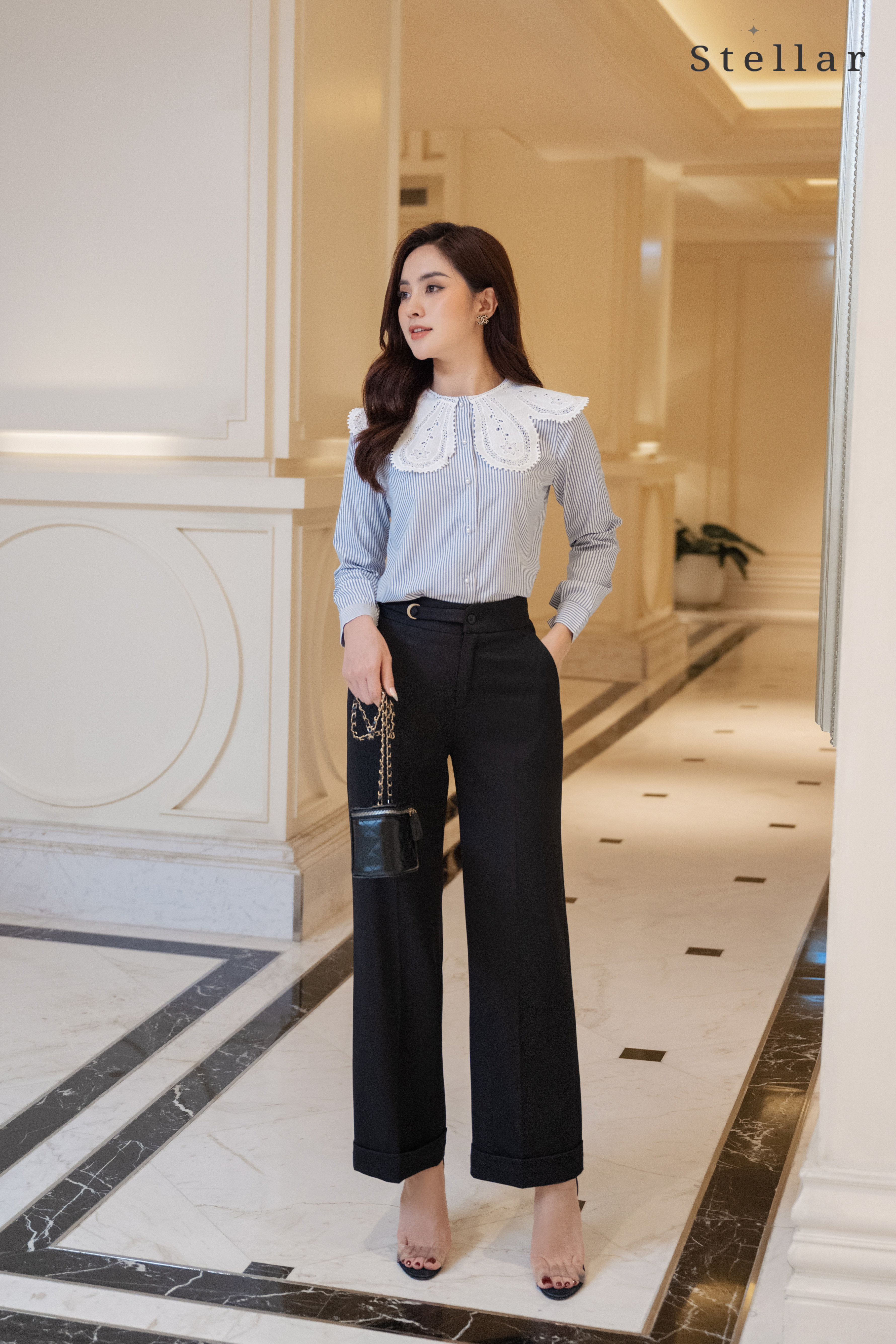 Kiểu dáng:  Quần xuông đen, lơ vê gấu, cài khoá vàng