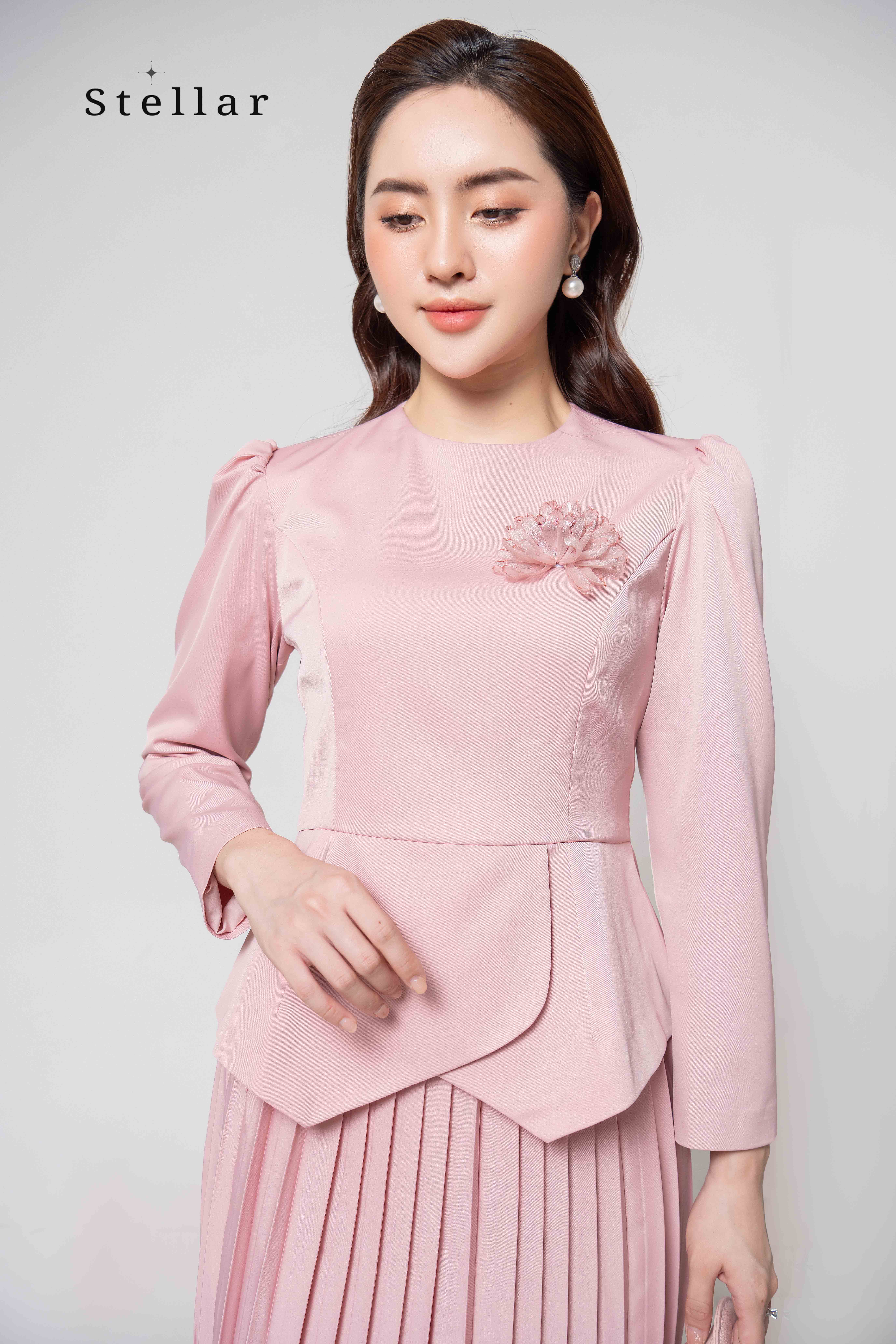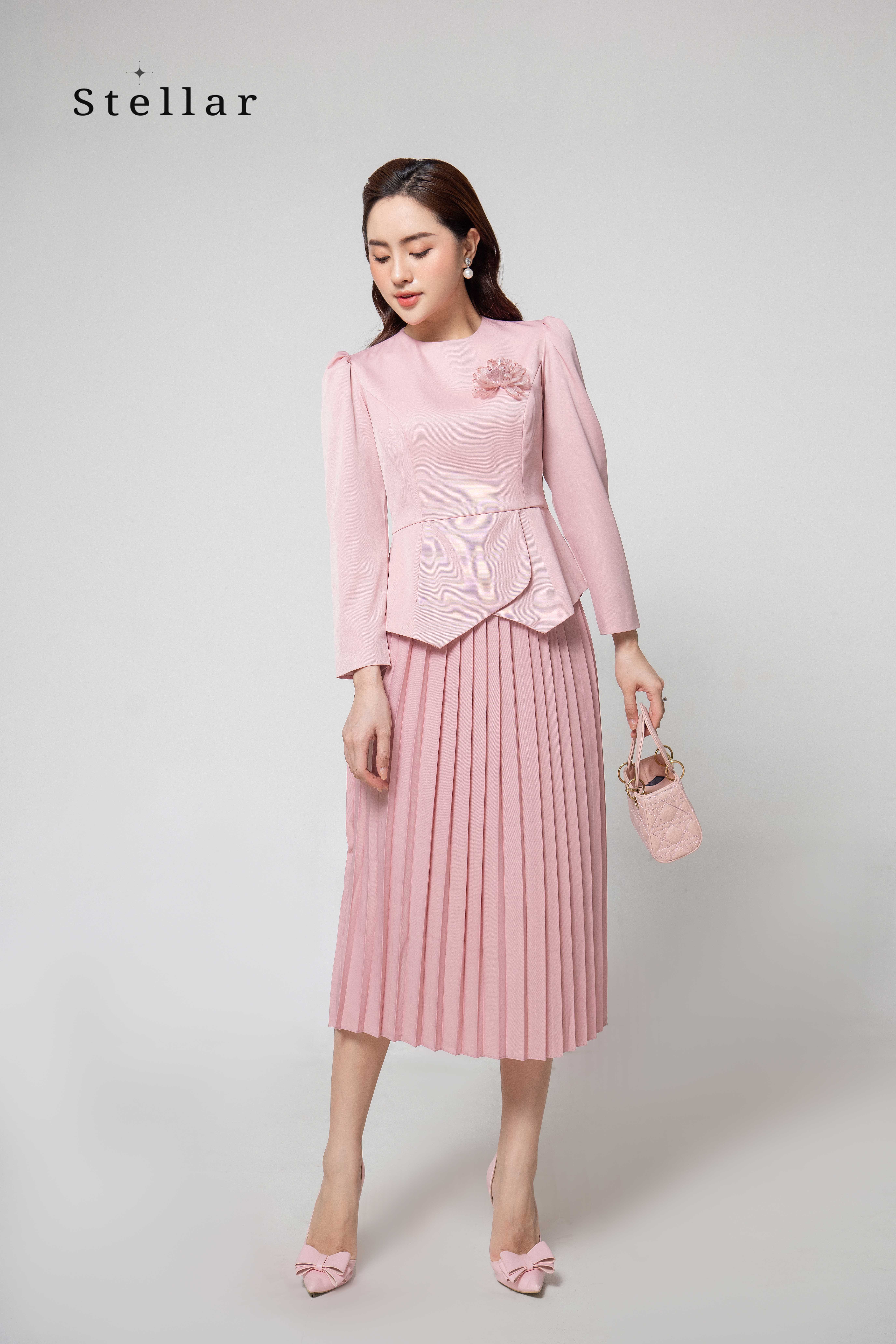 Kiểu dáng: Set váy peplum hồng pastel; 2 lớp. Tay bồng, cổ tròn. Vạt peplum cắt out kiểu peter pan giúp che khuyết điểm và làm cho thân hình mềm mại.